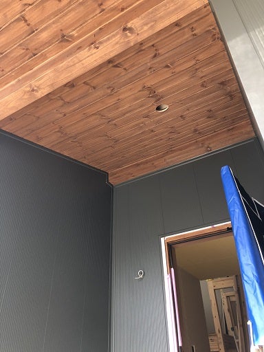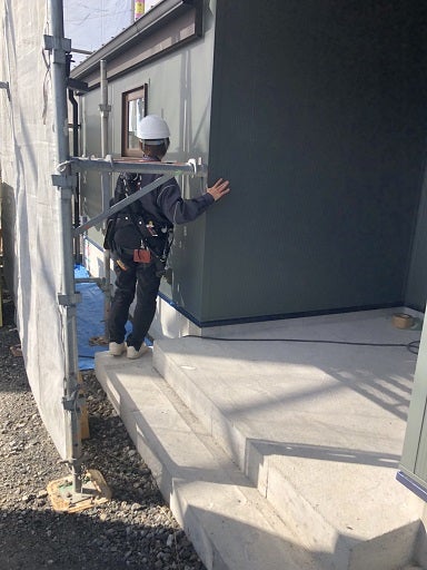 モスグリーンの外壁が更に引き立つかっこいい軒裏の仕上げとなりました。これにて外装部分の工事が終わったので早速社内の足場撤去前検査を実施しました。