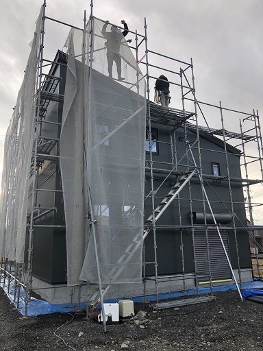 まずはネットからはずしていきます。全ての外部足場は午前中には撤去され重厚感あるかっこいい姿が現れました。週末の現場打合せにてT様にご覧頂くをの楽しみにしております。