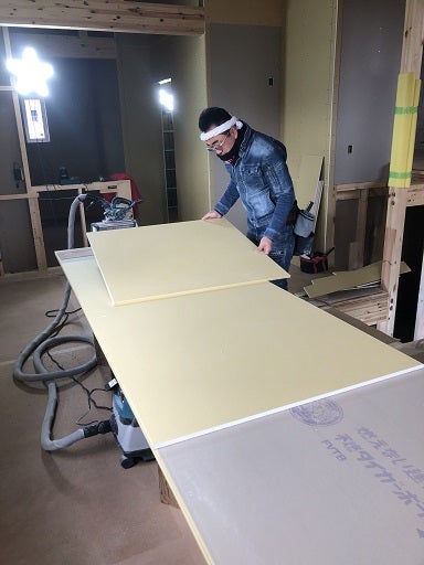 棟梁は壁のプラスターボード張りを進めています。