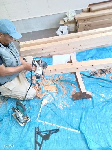 そして柱(住宅で使う桧柱)を加工して土台としっかり固定します。