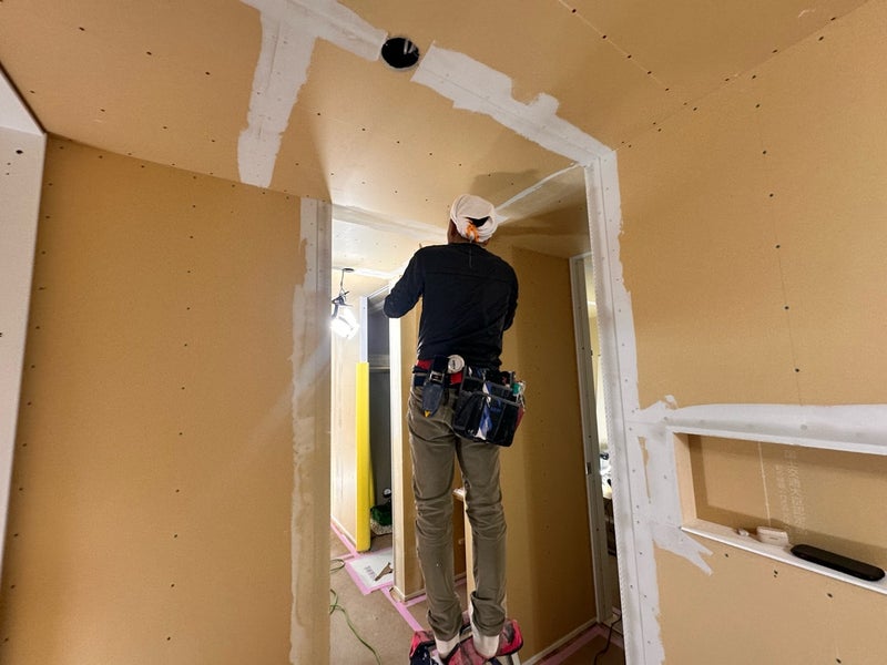 1階の方はクロス仕上げとなっています。今週はボードの目地のパテ処理を行なっています。貼り始めるのは来週からになりそうです。