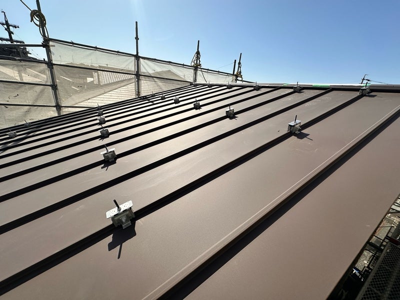外部はソーラーパネルの取り付けを行なっています。写真は屋根材にパネル用の金具を取り付けたところです。パネルが全て載った写真が撮れたらまたブログを更新するので楽しみにしていてください!