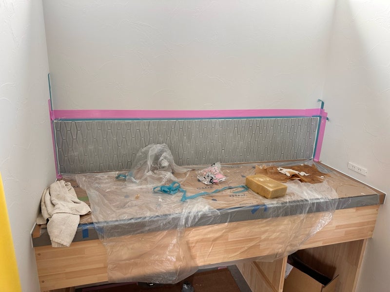 2階洗面のタイルの施工も行なっています。タイル施工が終わったら水栓と鏡の取り付けを行います。