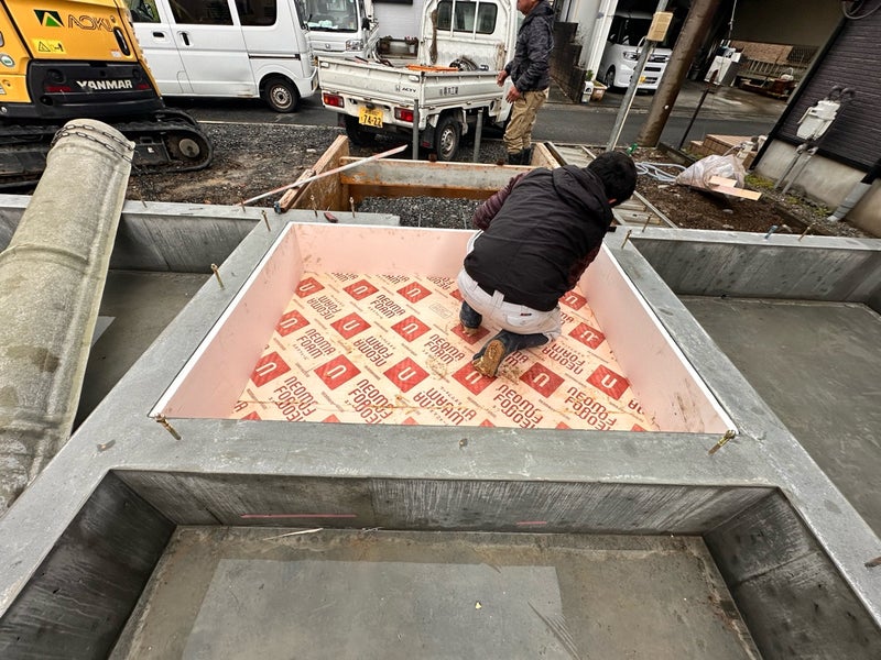 生コン打設から養生期間を経て型枠撤去、ポーチの荒打ち施工を行い、基礎工事が無事に完了しました。玄関部には底盤と立ち上がりにしっかりと断熱材を入れています。
