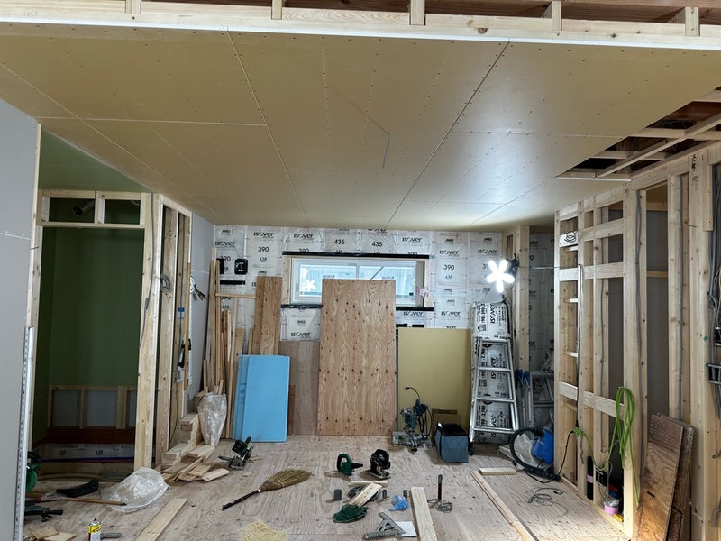 2階LDKの天井を施工しています。 リビングは勾配天井になっており、パインの羽目板で仕上げています。2階の天井を貼り終えたら1階の天井を進めていきます。来週はユニットバスの施工も行います。