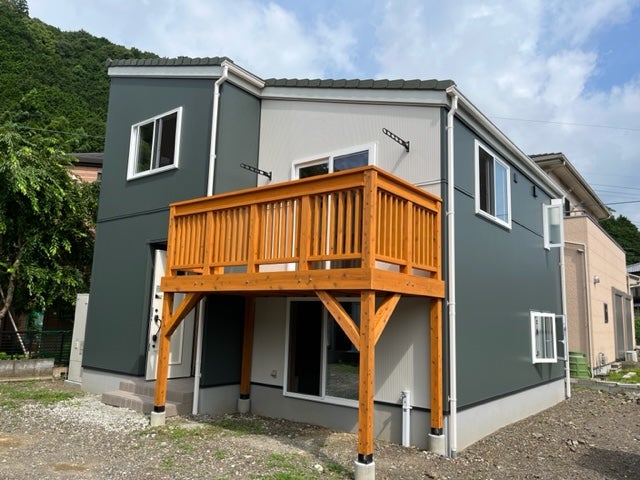ナチュラルオーク色のデッキが映えます!(外構は7月中旬には完成予定です)