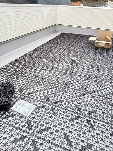 こちらは突風が吹くと飛んでしまうので、両面テープでしっかりと貼り付けます。屋上全体にひき詰めて完成しました(*^^)v