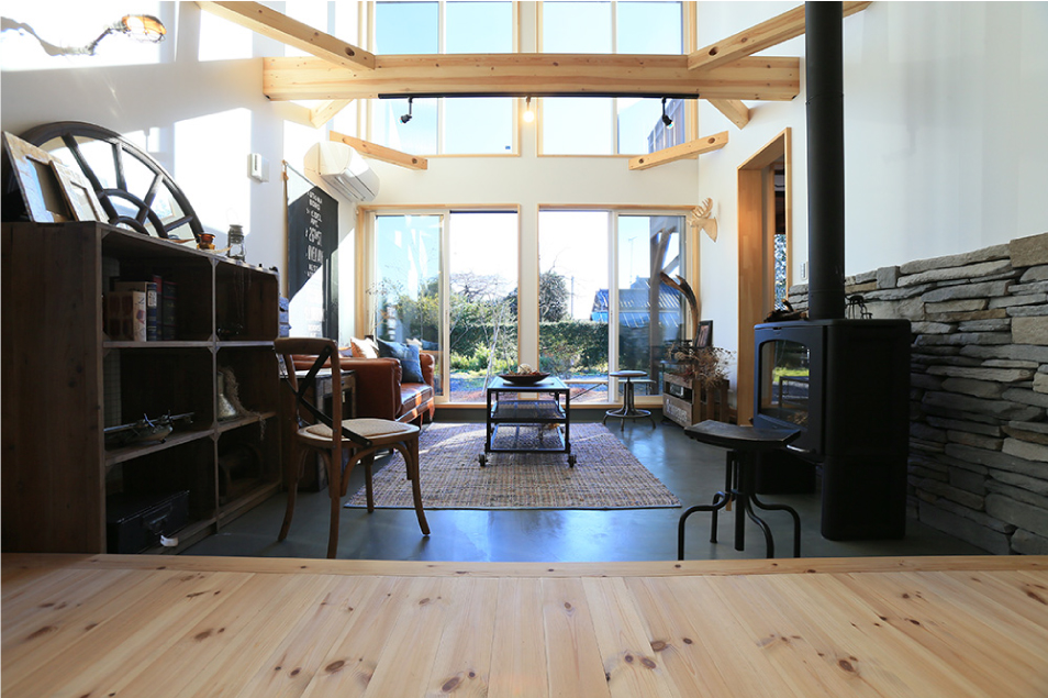 大きな吹き抜けのある、開放感たっぷりのLDK。大窓に面した土間リビングが家の内と外とを緩やかにつなぎ、暮らしをもっと自由にします。
