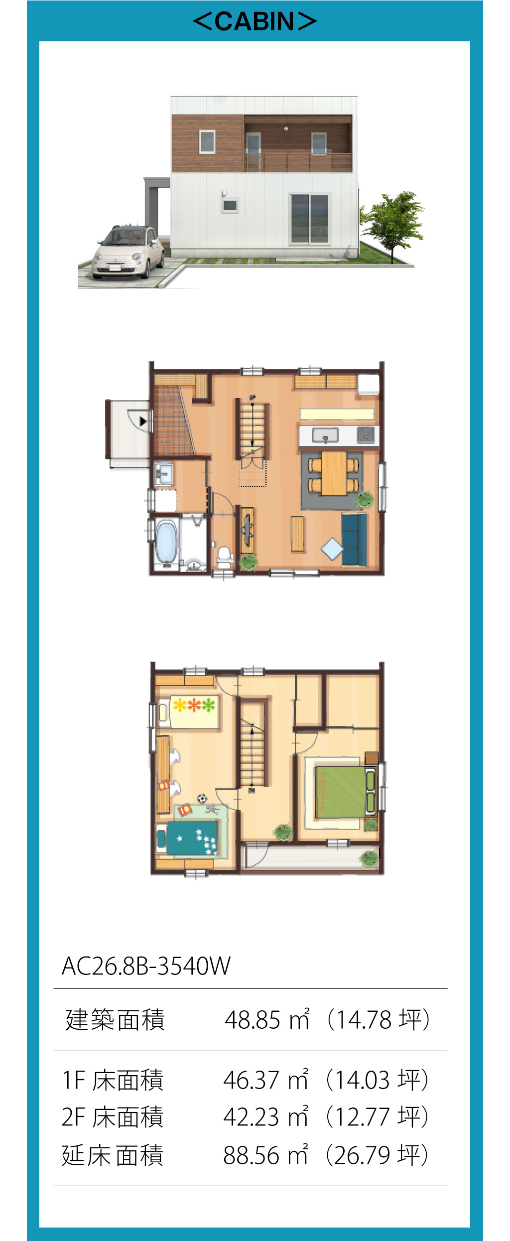 シンプルでコンパクトな最小形の2階建て。敷地を有効に使えるようムダをなくして建坪を抑えました。ガレージタイプもあります。