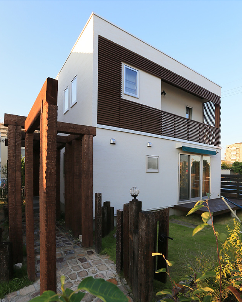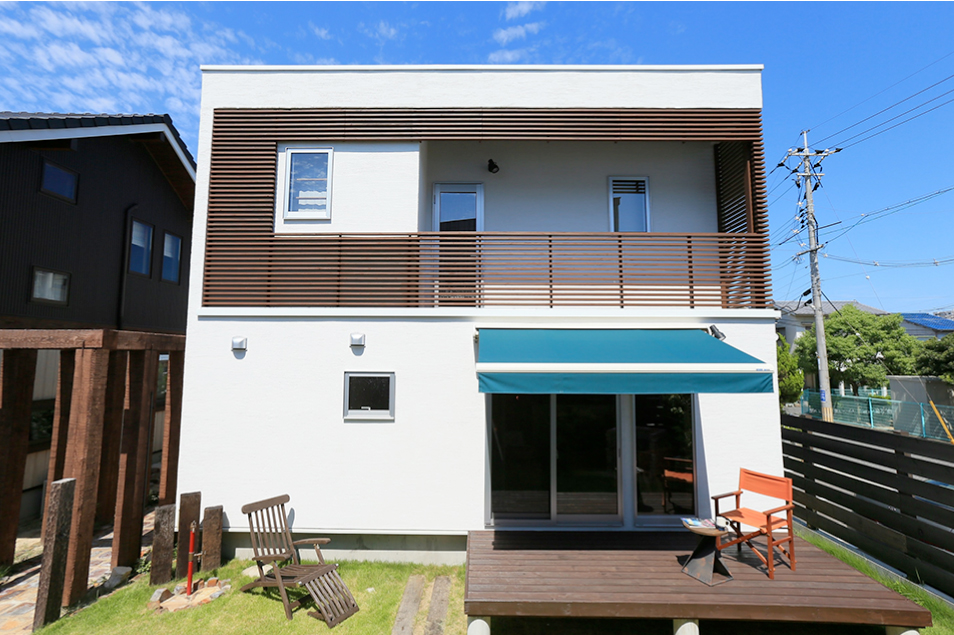 白い壁×木のルーバーの外観、自然素材の室内、第二のリビングとして使えるウッドデッキなど楽しく暮らすための工夫をギュッと凝縮。ビルトイン・ガレージタイプもあるので、ライフステージに合った使い方ができます。