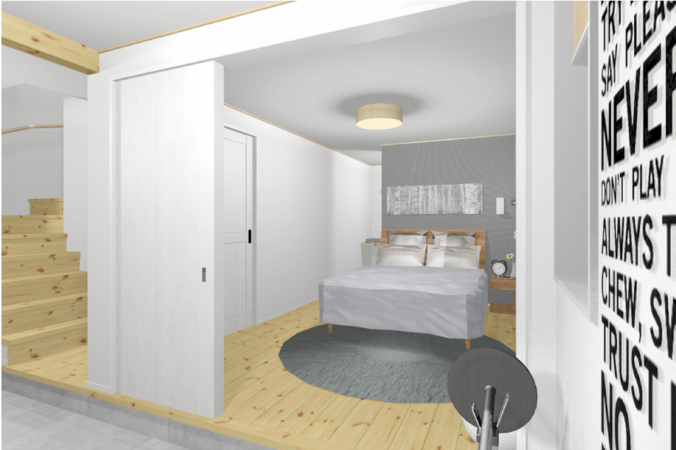 主寝室と大型収納、バス&サニタリーを集約した1階。玄関と連続する土間スペースは、ヨガやウェイトトレーニングにも余裕の広さ。プライベートなオフタイムを満喫できます。