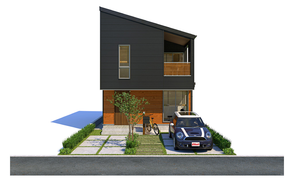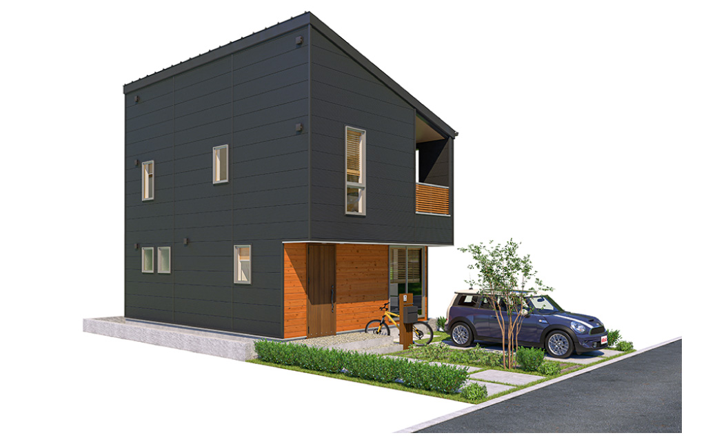 2階の一部を張り出したオーバーハングと片流れ屋根に個性が光るデザイン。1階の大きな窓は、玄関とつながる土間スペースにたっぷりと光をとりこみます。