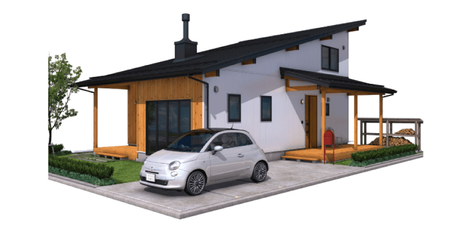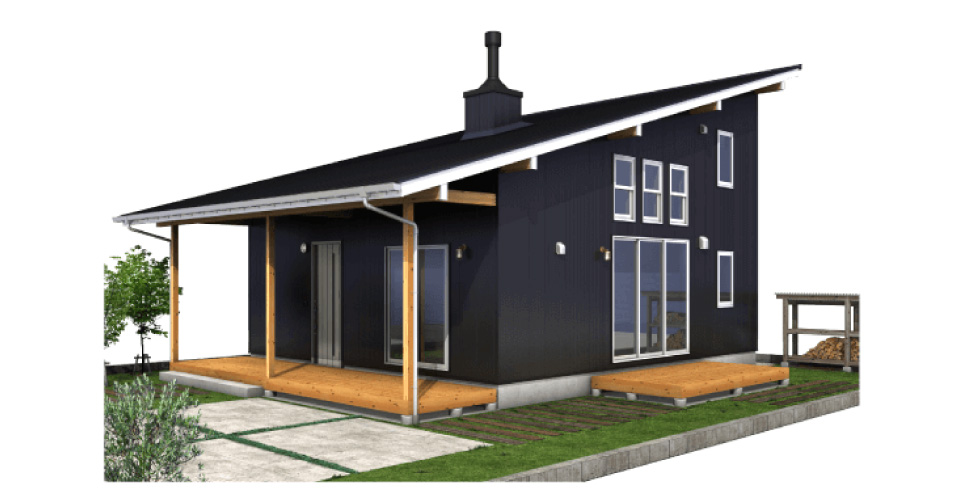 片流れ屋根のスタイリッシュな外観。広いウッドデッキでは、家族や仲間とBBQを楽しんだり自然の風を感じながら読書を楽しんだり。リゾート気分を味わえます。
