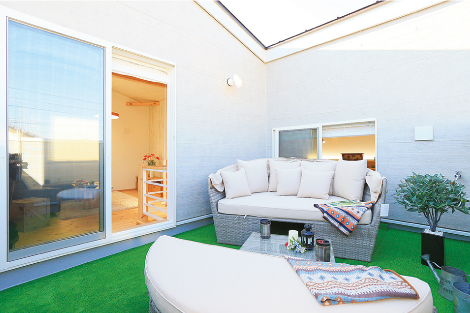 家の内外の間にあるスカイバルコニーでは、優雅なアウトドア気分が楽しめます。ほかにも自由に使えるマルチスペース、季節品や趣味の道具をたっぷりしまえるインサイドストッカー、見せながら収納できるオープンシェルフなど、女性目線の工夫が盛りだくさんです!