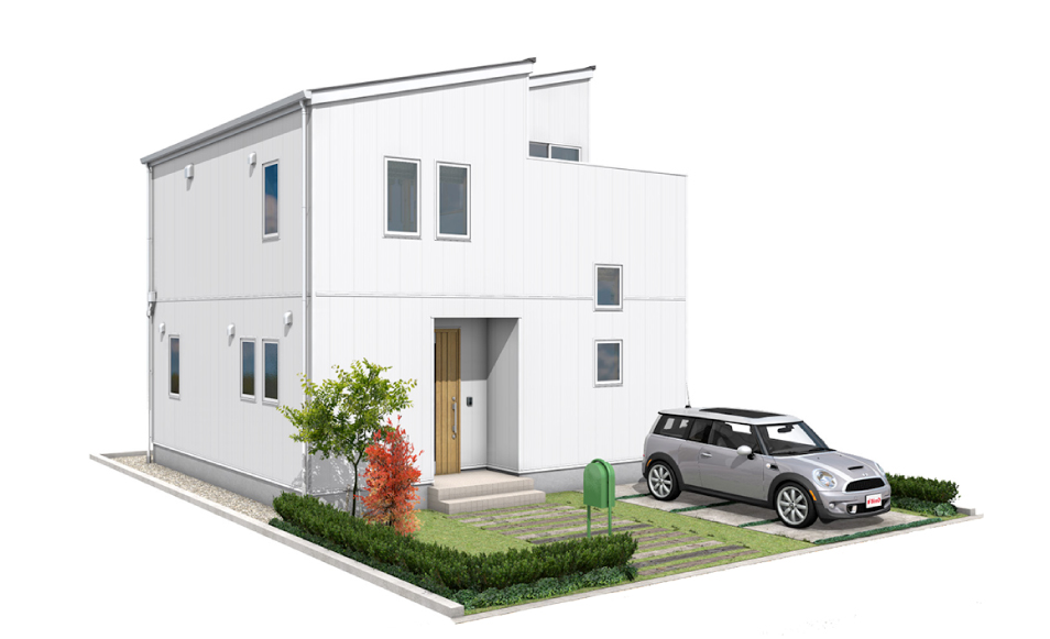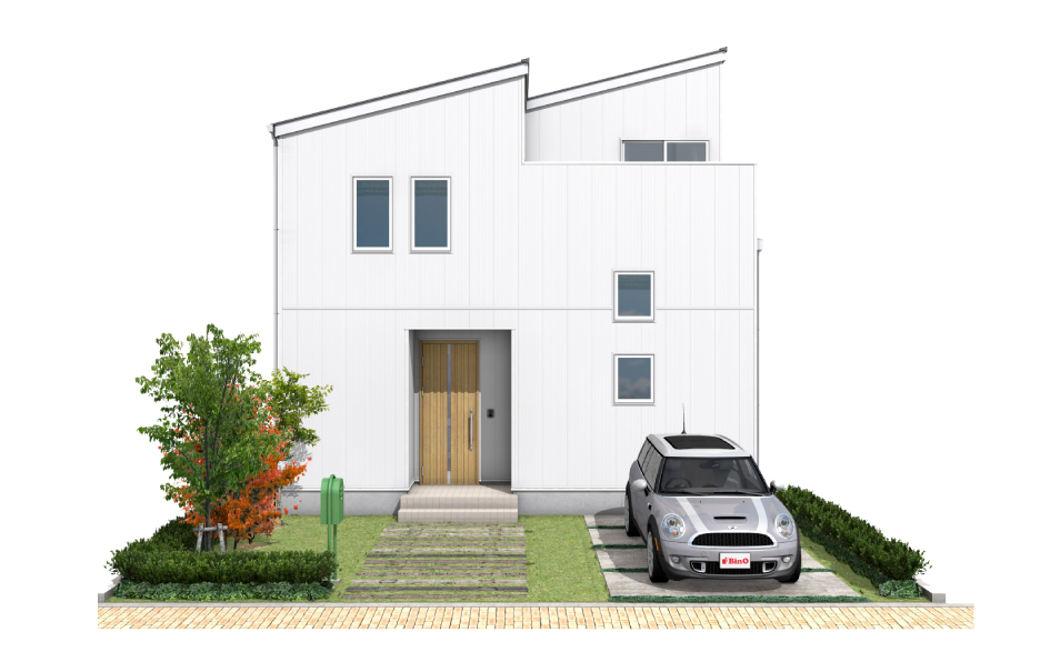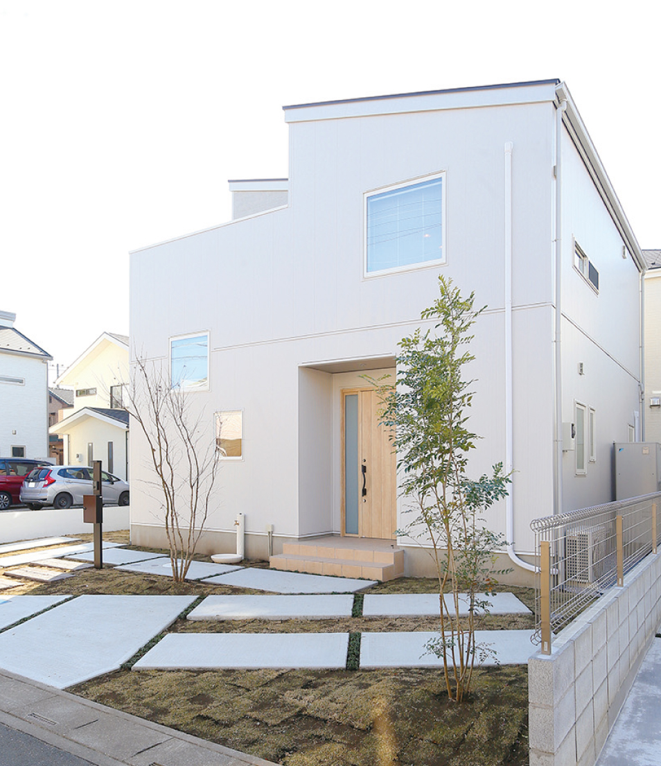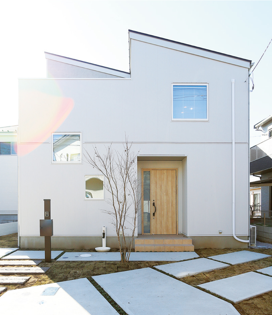 シャープなフォルムとリズミカルに配置された窓が、どこかキュートな雰囲気を醸し出すファサードです。シンプルな美しさと機能性を兼ね備えた穏やかで落ち着いたデザインは、街並みにも馴染みやすく住まう人の人柄をさりげなく表現します。