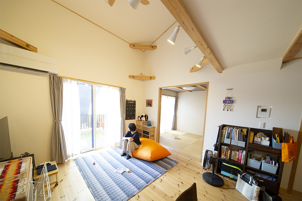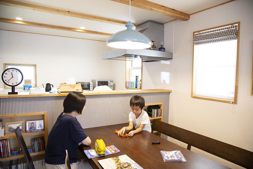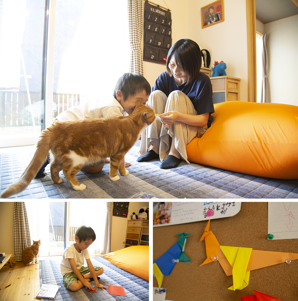 奥様:リビングで子どもとくつろいでいる時間が好きです。ウッドデッキの上に軒が出てるから日陰にもなって、部屋には直射日光が当たらないんです。初夏はエアコンを付けなくても窓を開けとけば風が入って十分涼しかったです。多少の雨なら入ってきませんしね。明るくて風の通りも良くて、すごく居心地がいいんです。最近は子どもが折り紙ブームで、一緒に本を見ながら作ってます。