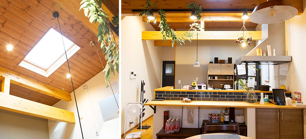 ▲天窓がついてるので、日中は自然光だけで十分明るいキッチン。夜はライトの灯が落ち着いた雰囲気を演出し、ホッと一息つける空間に。