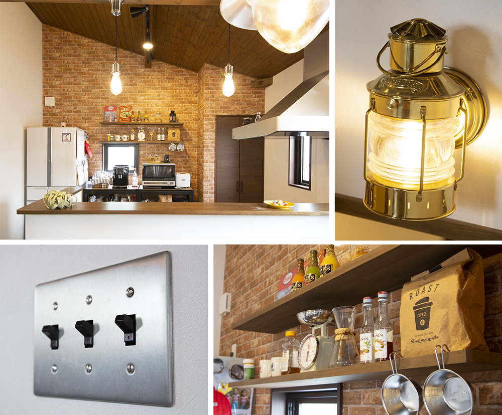▲取材スタッフが思わず「お洒落!」とテンションが上がってしまった、カフェのようにオシャレに陳列されたキッチン棚とデザインが凝っている階段照明。カッコいい感じにしたかったと、スイッチは全てアメリカンスイッチに。無骨な感じがクール!